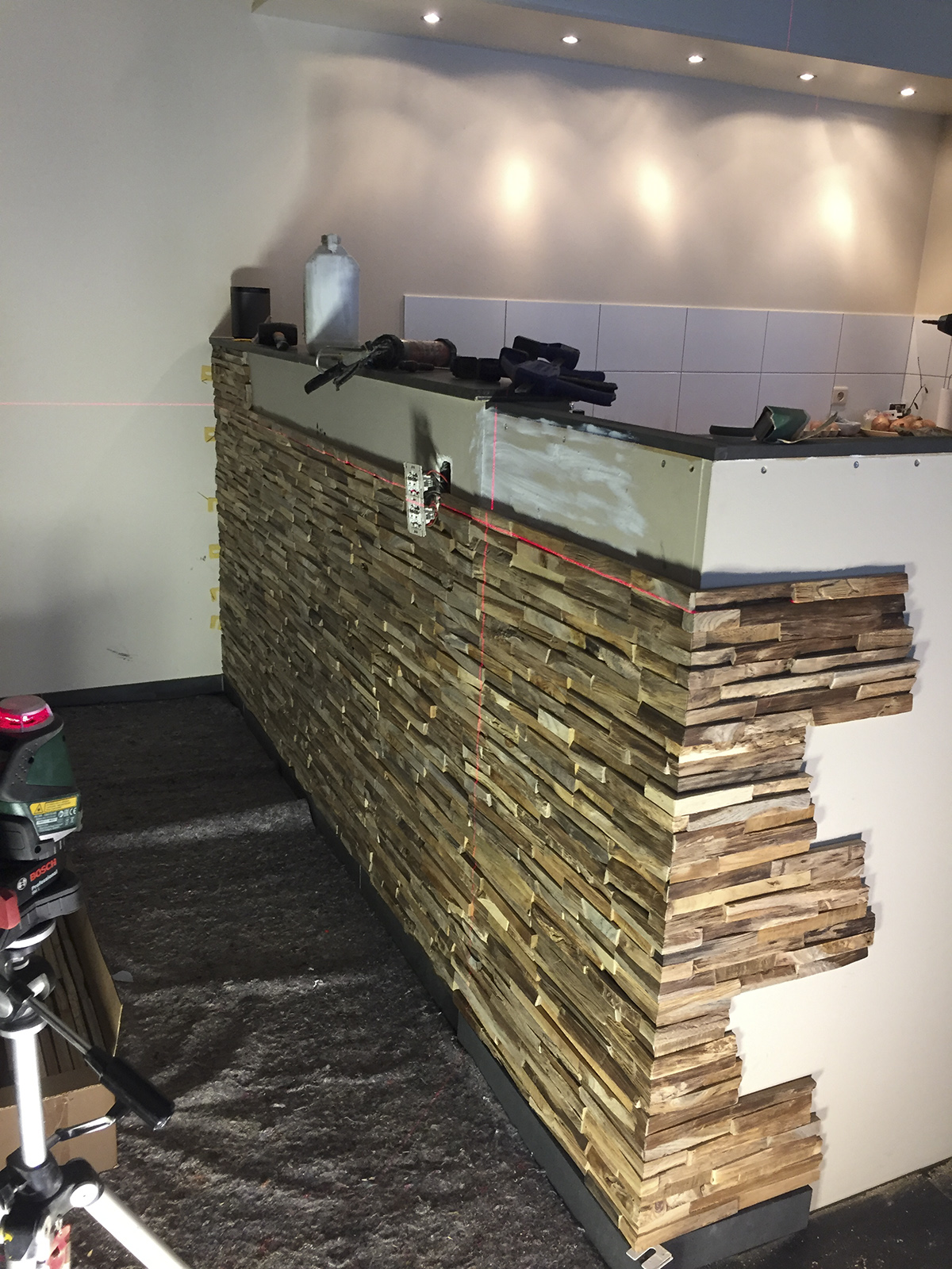 Totale interieur inrichting van een duplex. Muren uitgevoerd in zelf gebrande en behandelde Shou-Sugi-Ban hout, kasten uit hoogwaardige multiplex gecombineerd met oude 'gerestaureerde' eiken planken, tv-meubel en boekenrek ook uit zelfde eik.